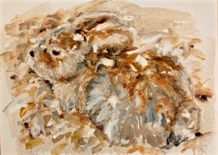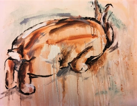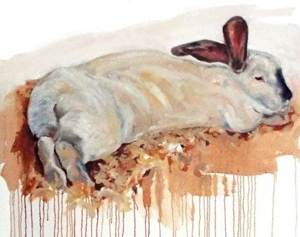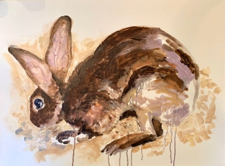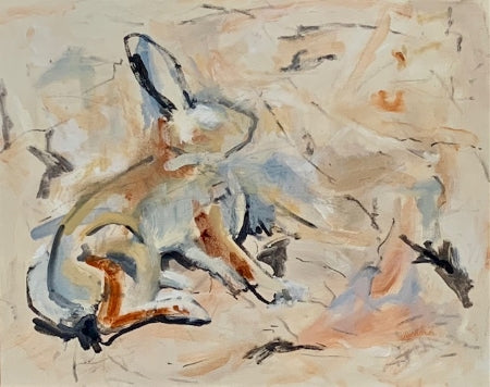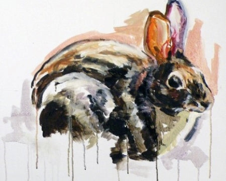 Charlotte's portfolio of oil on canvas paintings depicting rabbits in motion has been described as being at once both feral and elegant. While her early paintings gained inspiration from Matisse and de Kooning, these creations built upon even earlier representations and went more primitive, drawing comparisons and inspirations from Lascaux cave paintings. Her signature style was cemented with this collection as she learned what rules she wanted to break and freed her personal style to soar across the canvas, running with the rabbits. All canvases are framed in natural wood and ready to hang.