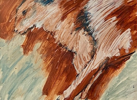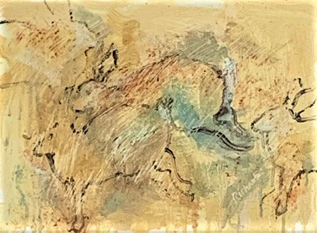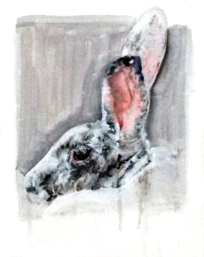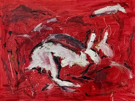Charlotte's portfolio of oil on canvas paintings depicting rabbits in motion has been described as being at once both feral and elegant. While her early paintings gained inspiration from Matisse and de Kooning, these creations built upon even earlier representations and went more primitive, drawing comparisons and inspirations from Lascaux cave paintings. Her signature style was cemented with this collection as she learned what rules she wanted to break and freed her personal style to soar across the canvas, running with the rabbits. All canvases are framed in natural wood and ready to hang.